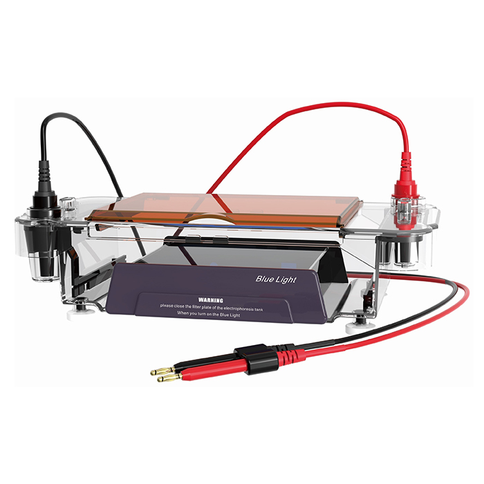 Vodoravna elektroforezna celica s pomočjo električnega polja poganja migracijo nabitih molekul v gelu in ločuje molekule na podlagi njihovih različnih hitrosti migracije v električnem polju. Gel se vstavi v elektroforezni rezervoar, vzorec pa se naloži v gel prek rezervoarja za vzorce. Elektrode, priključene na vir napajanja, ustvarjajo električno polje, ki ločuje molekule v vzorcu glede na razlike v velikosti, naboju ali morfologiji molekul. Med tem procesom se elektrofereza opazuje v elektrofereznem rezervoarju z obsevanjem z modro svetlobo, da se v realnem času spremlja ločevanje vzorca. Med potekom elektrofereze se vzorci postopoma ločujejo in tvorijo pasove. Naprava za spremljanje v realnem času z modro svetlobo lahko pomaga eksperimentatorju, da kadar koli preveri stanje elektrofereznega pasu in tako zagotovi nemoten potek eksperimenta. Hkrati zasnova pokrova s kljukico in funkcija samodejnega izklopa zagotavljata varnost eksperimentatorjev.
